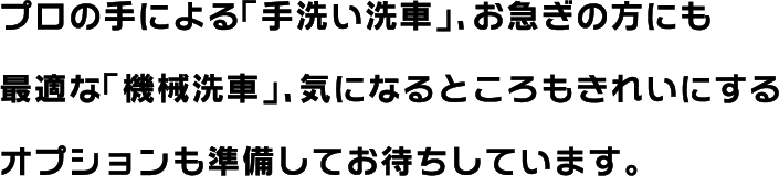 プロの手による「手洗い洗車」、お急ぎの方にも最適な「機械洗車」、気になるところもきれいにするオプションも準備してお待ちしています。
